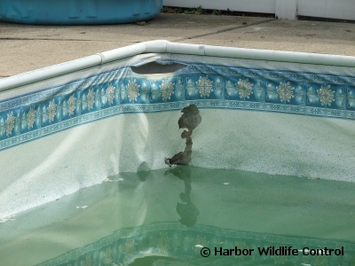 Most muskrat damage is caused by their burrowing. They burrow into earthen dams, dikes, levees, and railway embankments, weakening their structures. They also burrow into the banks of ponds, canals, and irrigation and drainage ditches. Their tunnels may drain a small farm pond. They may damage swimming pools, floating docks, marinas, and boathouses. Muskrats will cross yards. Some people are frightened of them, or mistake them for Norway rats.